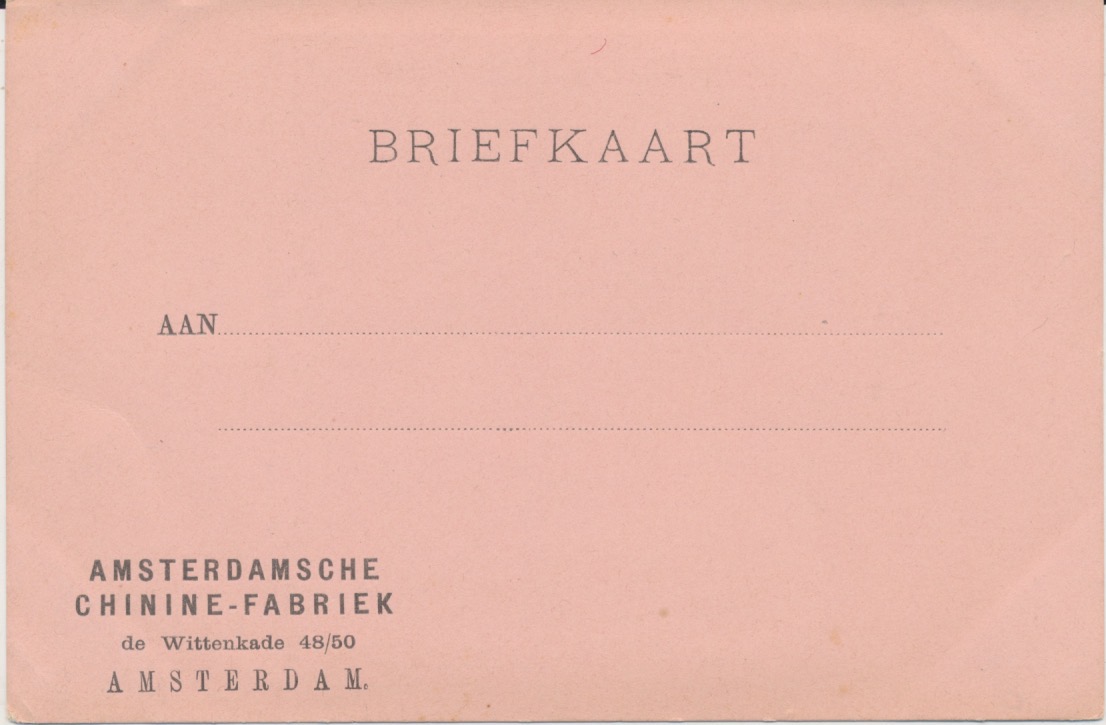 geplakt op BRIEFKAART van Amsterdamsche Chinine-Fabriek, de Wittenkade 48-50, knutselwerkje