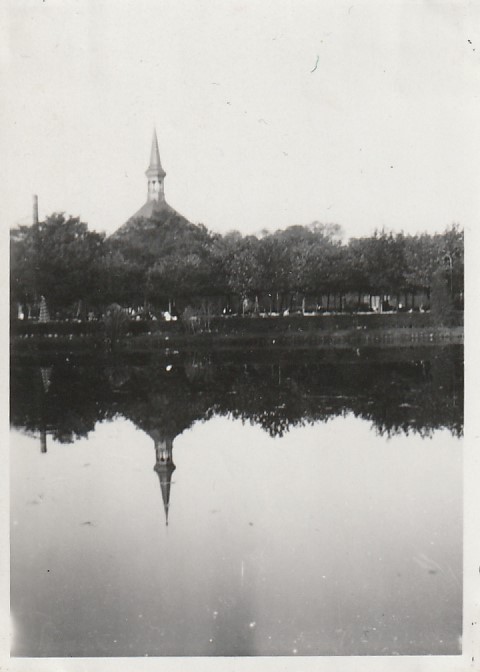 Ik denk toch dat het de Parkkerk is. Op het zptje staat links een parasol, dus ik vermoed dat de foto van over het water en de tennisbanen gemaakt is.