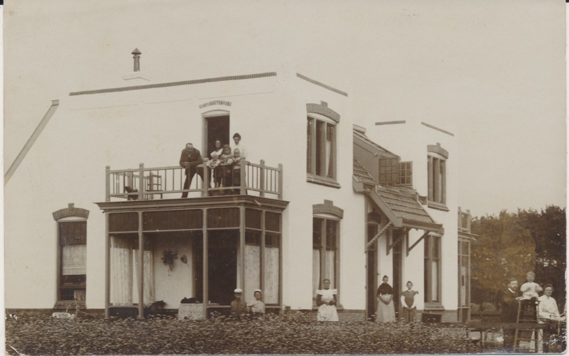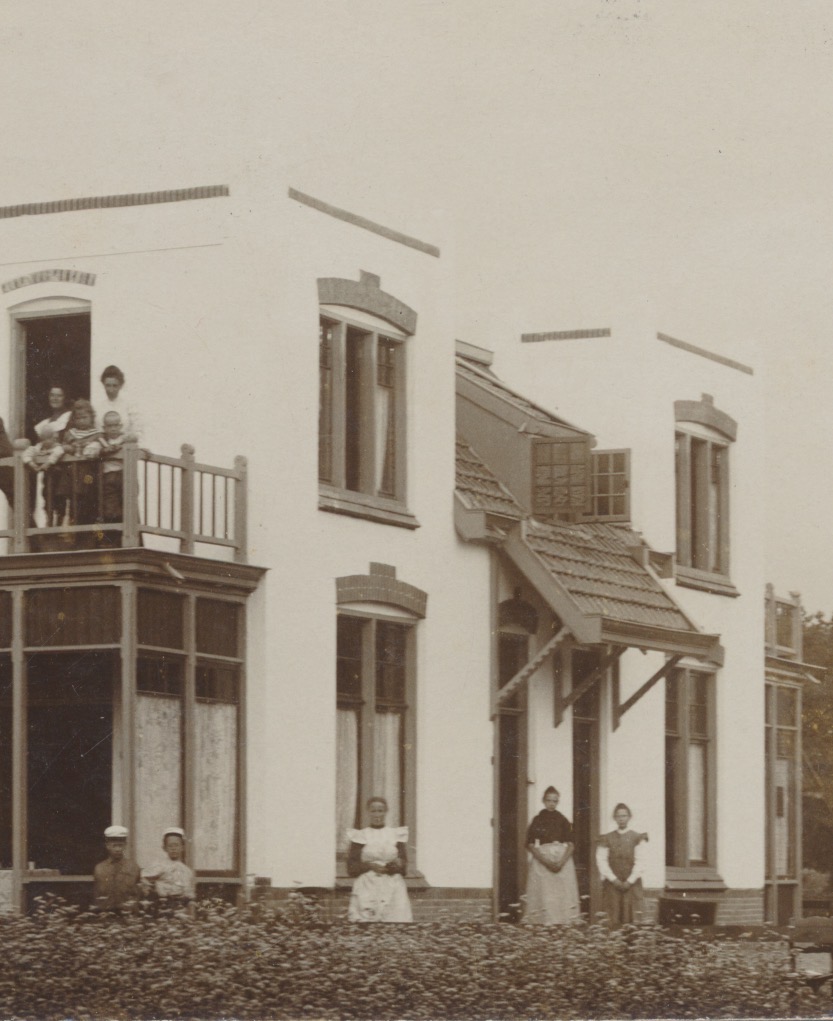 symmetrisch gebouw met aan beide zijden een balkon boven serre