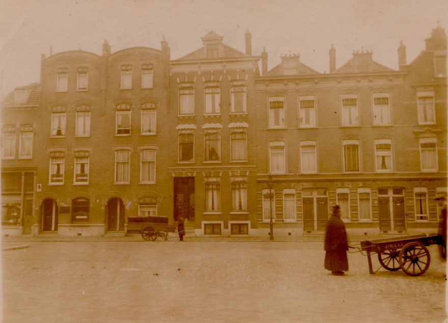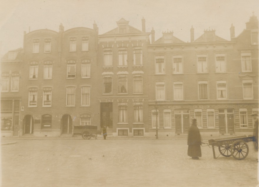 rechts een blok waarvan 3 woningen zijn te zien, fors vormgegeven onderpui en rechts een verhoogd dak met zolderraam; de dakkapellen van de 2 linker panden hebben op de dakkapellen opvallende versieringen