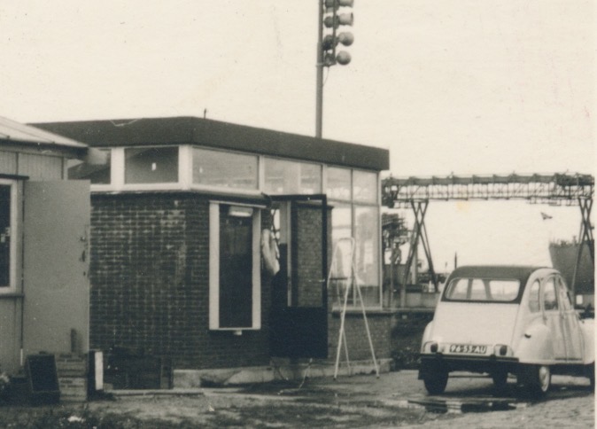 v.l.n.r. een bedrijfsgebouw, een keet waar verkoop plaatsvindt met buiten kratten en uitstalling, stenen huisje met reddingsboei [?], een bovenloopkraan met rechts nog net een stukje van een schip