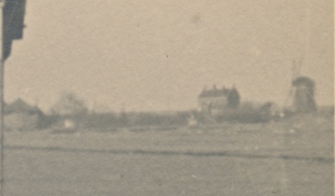 op de achtergrond molen en hoog gebouw