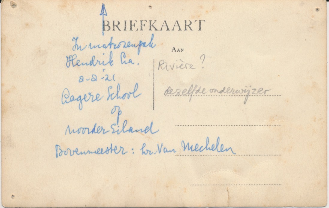 2 fotokaarten die bij elkaar hoorden, richtpunt is het jongetje in matrozenpak Henkie L. / Hendrik La. (zelf wat gezocht, wordt bedoeld La Rivière - misschien ver gezocht?) 8-8-'21 en dezelfde bovenmeester op beide kaarten hr. Van Mechelen