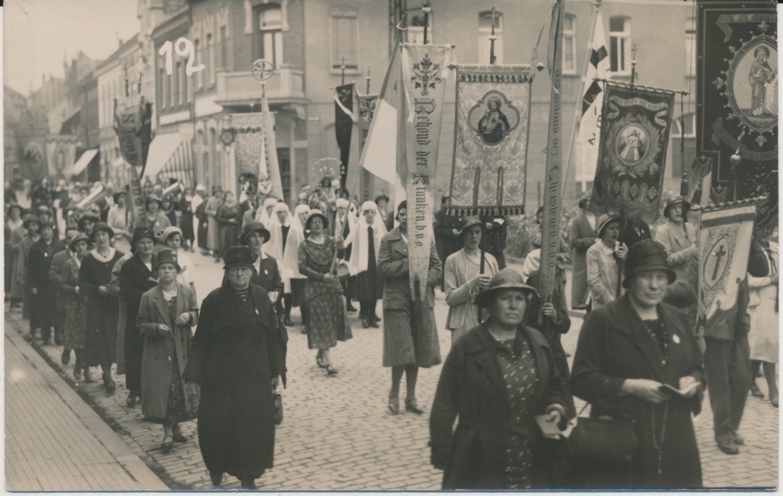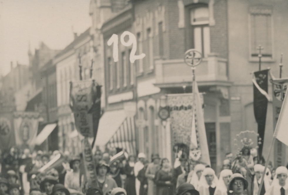 belijnde ongelopen fotokaart, processie van louter dames