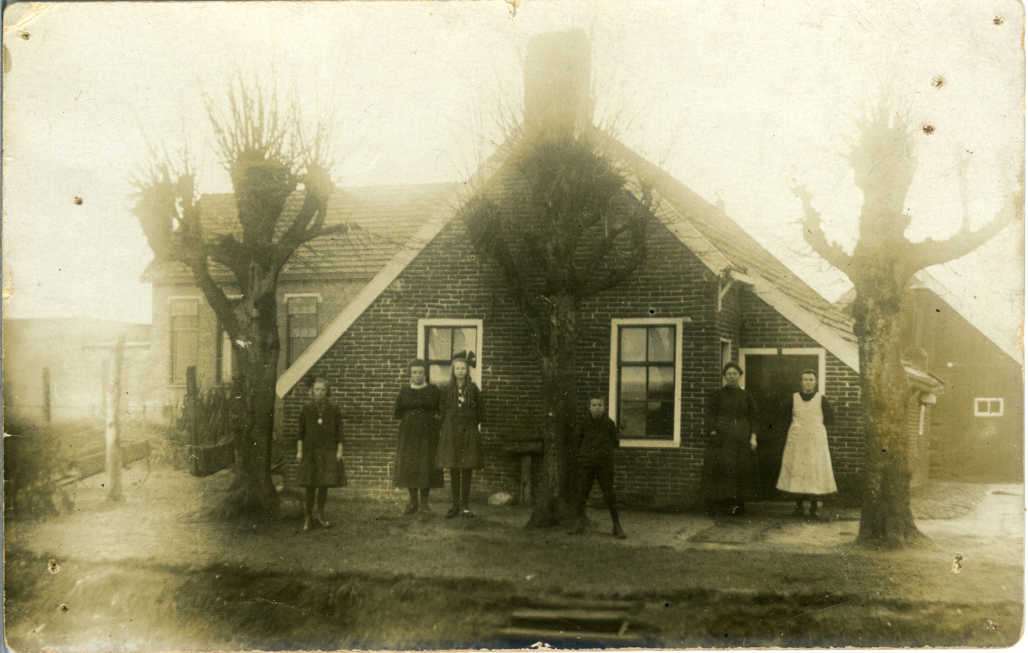 Schoolgebouw achter een woonhuisje vermoedelijk in het Noorden des lands, geen informatie verder.
