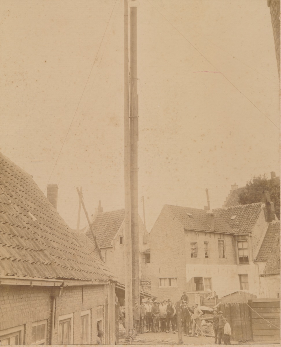 bovenaan de hoge buis een soort netwerkje / opgewerkt kapje, de buis / pijp bestaat uit losse aan elkaar vervaardigde onderdelen; halverwege is een ketting aangebracht; vanaf daar iets boven loopt er een dun touw naar beneden; op de achtergrond een dunne mast met 3 schuine uitsteeksels