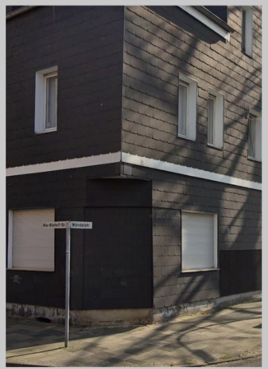 Dan het gezochte pand. Ik denk dit pand op de hoek van de Max-Wiethoffstrasse (vroeger Wilhelmstrasse) en Händelstrasse (vroeger Schulstrasse) staat, maar drastisch gewijzigd (alsof die Franse inpakkunstenaar er mee bezig is geweest):