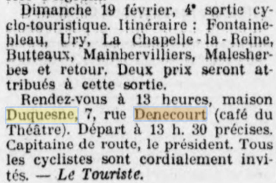 In het volgende krantenbericht uit L’informateur de Seine&Marne 19-2-1928 wordt er een fietstocht (zie UVF op het zoekplaatje) gestart vanuit dit café du théâtre, oftewel maison Duquesne: