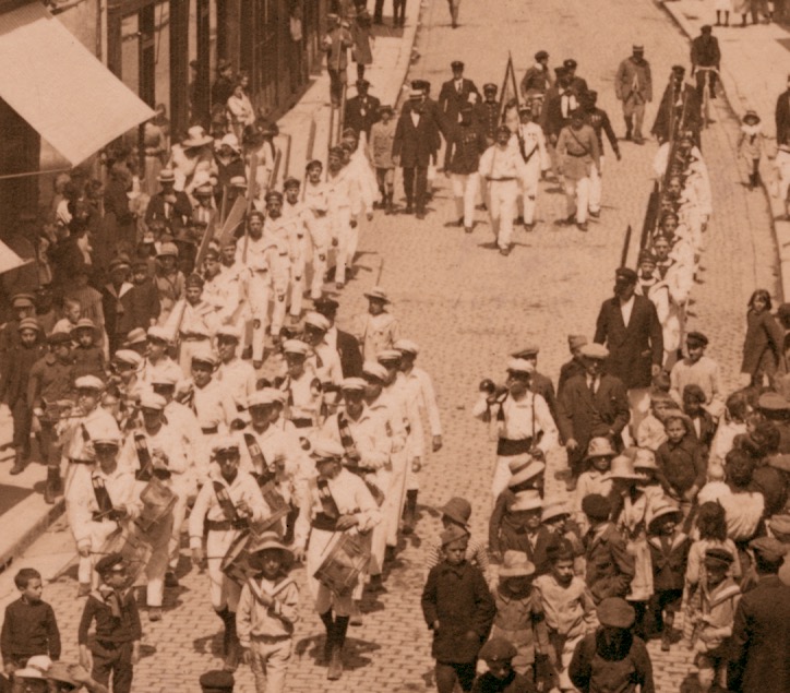 6700 straatgezicht met vlaggen en marcherende matrozen in grote stad