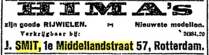 Er zat een fietsenmaker J.Smit op 1e Middellandstraat 96 in …. jawel.