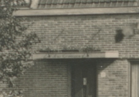 op het afdak boven de de deur van nummer 17 is een tekst geschreven