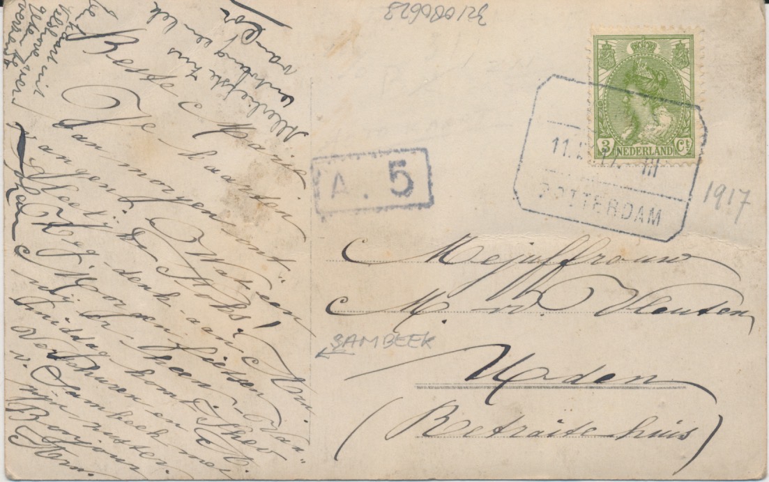 belijnde gelopen fotokaart verzonden naar Uden, treinstempel 1917 is voor een deel onleesbaar, onderaan Rotterdam