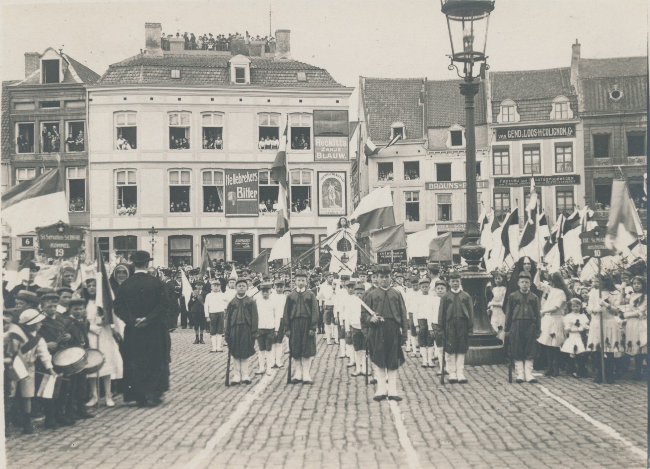 kinderen met borden St. Servatiusschool Kommel 19 en Ext. St. Mar[ia?] Boschstraat 10