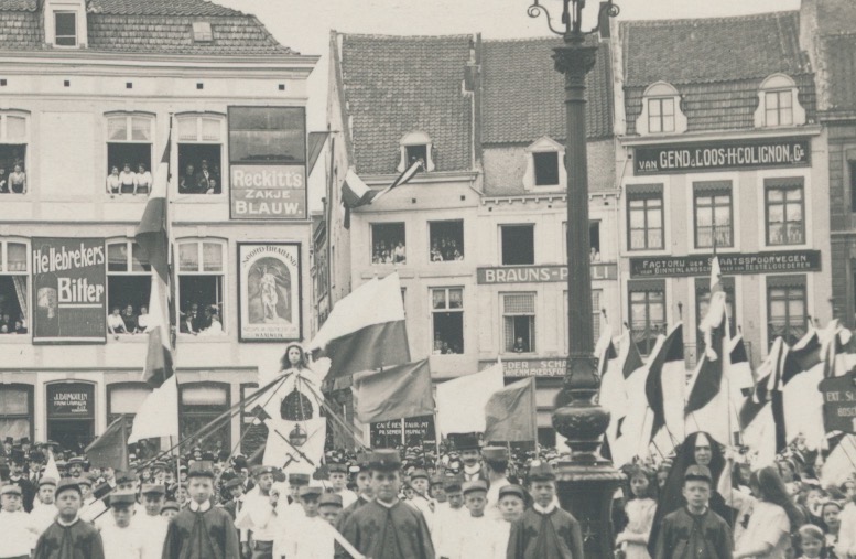 mensen op dak van pand waarin J. Dumoulin, horeca, op de gevel Hellebrekers Bitter, ook Reckitt's zakje blauw en Noord Braband verzekering