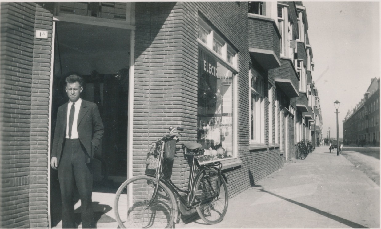 op de linker etalageruit Rijwielen, W.A. de Vries. onderdeelen - reparaties