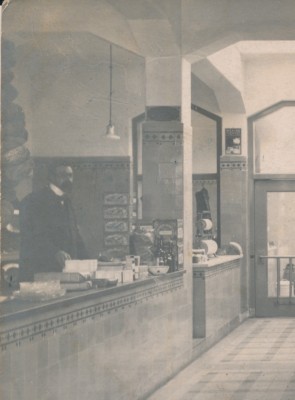 rechts koffie, thee en tabak waaronder pijpen, aan de muur reclame voor Gouda kaarsen; op de deur een bordje waarop zuurkool