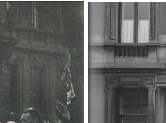 De bovenkant van de vensters (benedenverdieping) van Oever 13 zagen er vroeger anders uit, hier ZP vergeleken met een verdere foto uit het felixarchief: