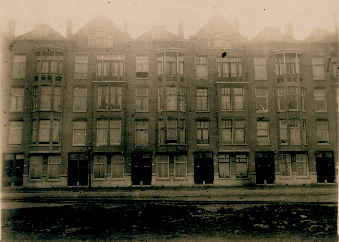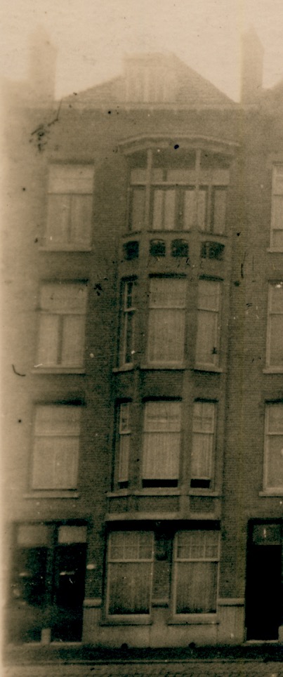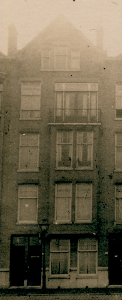 2 - 4, iets uit de gevel stekende smalle rechthoekige erkers boven elkaar waarboven een balkon met ijzeren hekwerk