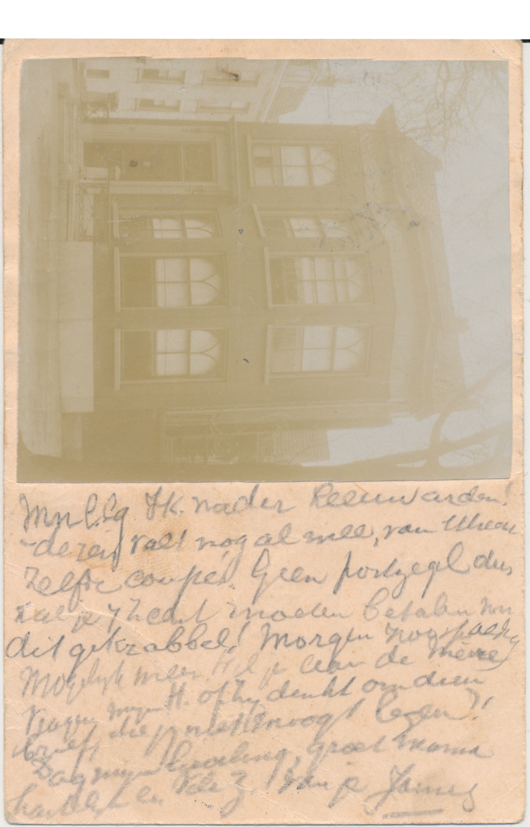 maar misschien is het een foto van thuis in Schiedam "Dag mijn lieveling, groet mama". Het blijft dan wel een raadsel dat het aankomstadres moet worden gewijzigd. Of het was een al eerder gebruikte kaart en is er een nieuw adres opgeschreven.