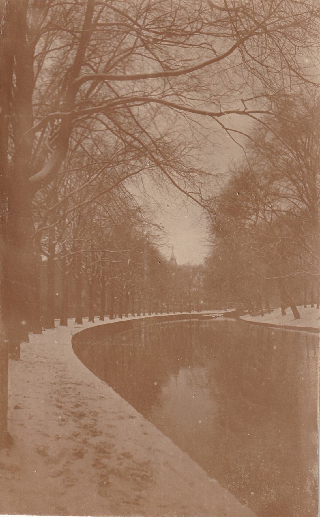 singel in een grotere plaats, toren in de verte