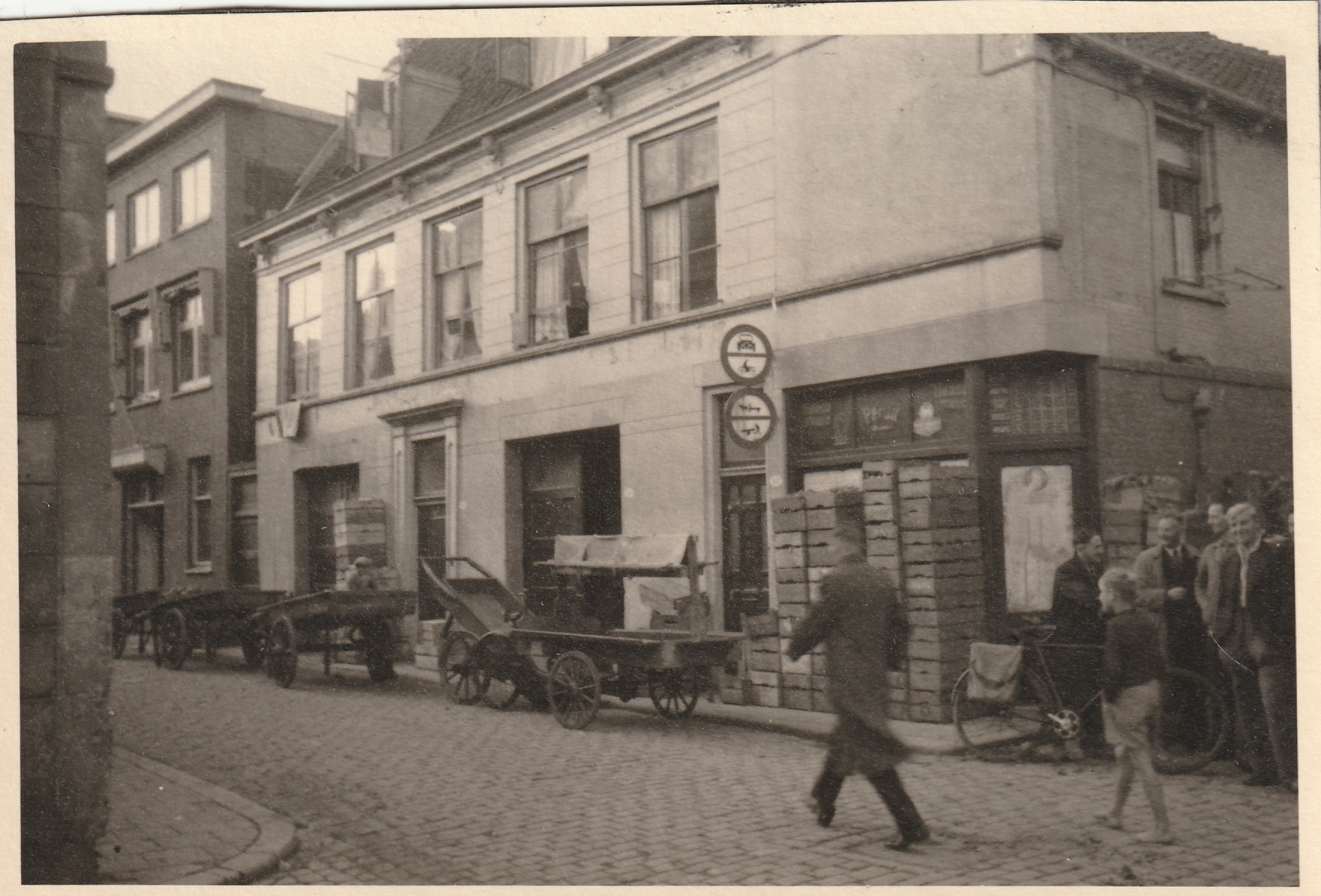 De straat inrijden met motorrijtuigen of wagens was verboden (https://auto-en-vervoer.infonu.nl/verkeer/162252-verkeersborden-1950-wegenverkeersreglement.html). Volgens die website zijn deze verkeersborden geïntroduceerd in 1951. Het tafereel oogt weinig grootstedelijk.