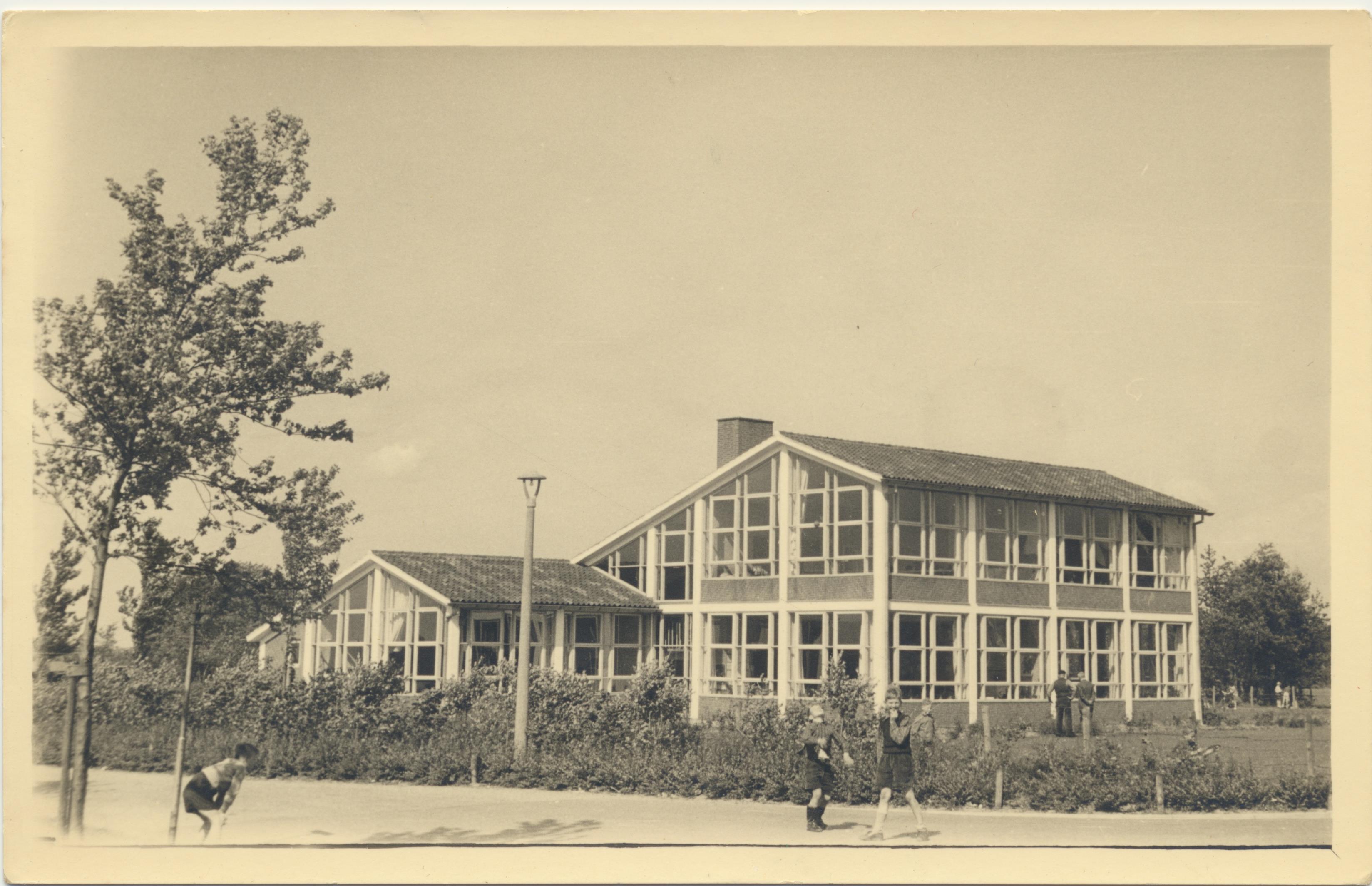 Gevaert-fotokaart met belijnde achterkant, waarop is geschreven "Herman Gorter school, Amersfoort"