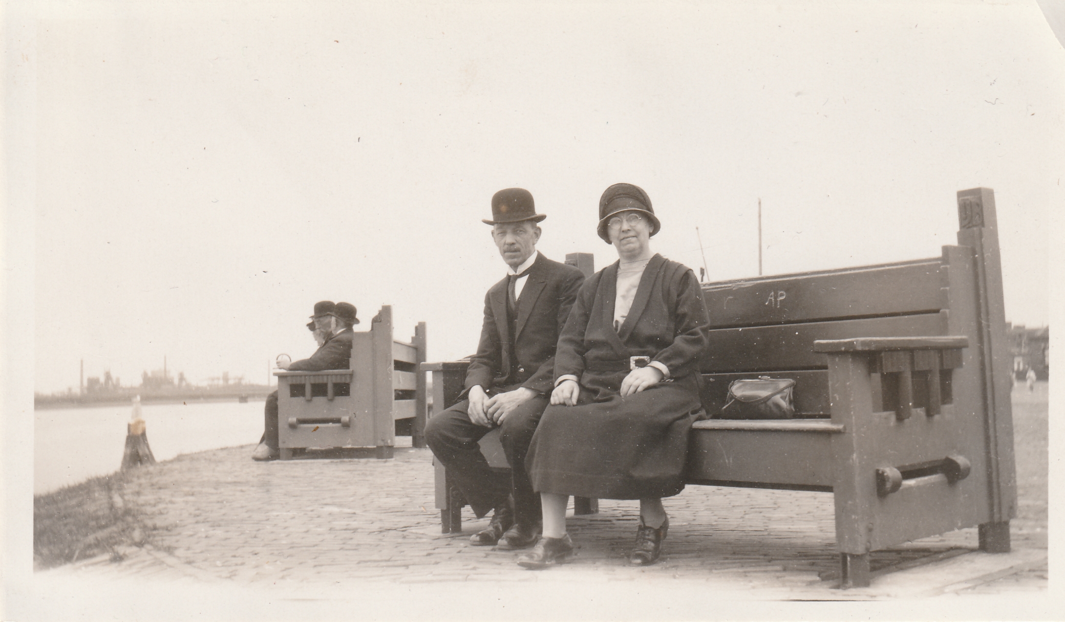 Ja hoor , de optelsom is voor mij 100 % overtuigend. De IJ in IJB staat zeer wel mogelijk voor Ijmuiden !. Op de foto,s van de bankjes in Ijmuiden klopt de afstand tot het water en hun unieke opstelling . De 3 vierkanten gaten in de leuning zijn op die foto,s ook te zien . De fabriek op de achtergrond is inderdaad de Hoogovens , heb een detailsscan van een ansicht ingestuurd . Ook heb ik nog een detailscan van de bankjes op een andere ansicht gevonden . Knappe oplossing van een lastig zoekplaatjes , top gedaan Peter