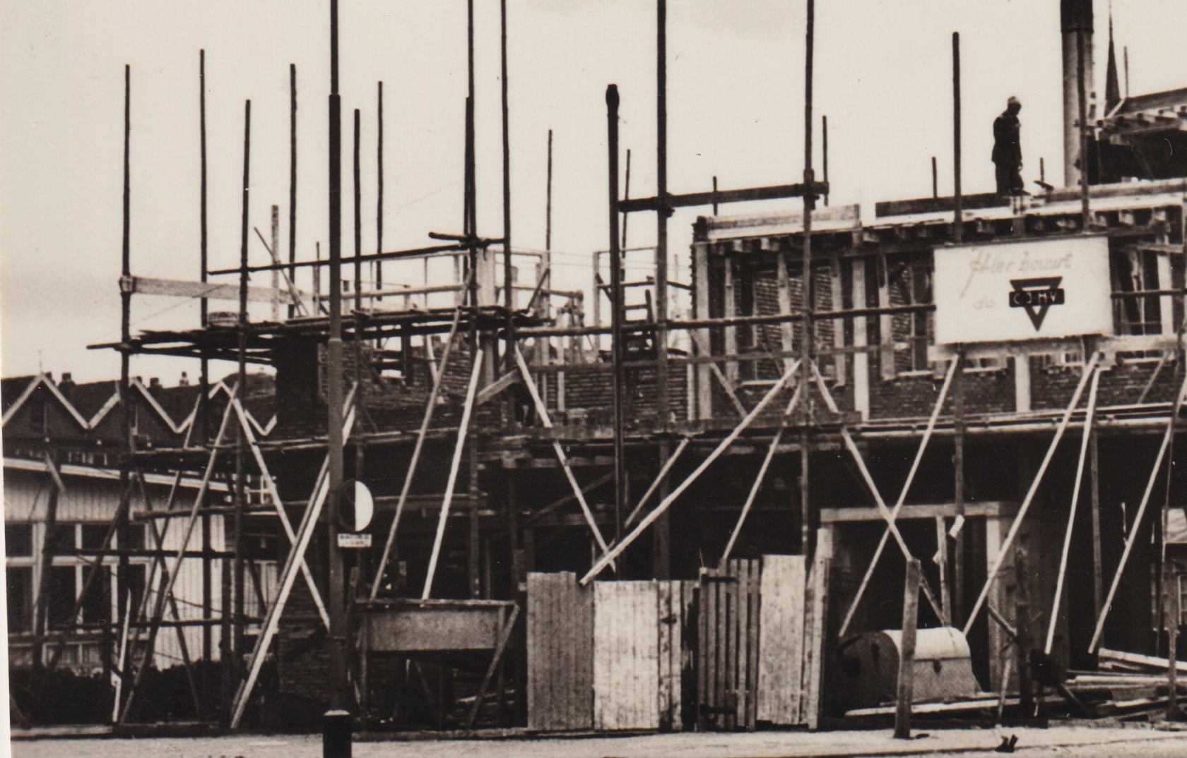 op het witte bord staat: Hier bouwt de C.J.M.V. (staat volgens mij voor Christelijke Jonge Mannen Vereniging)