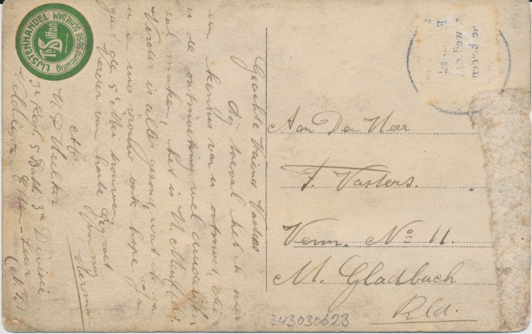 op de achterzijde linksboven een stickertje: Lijstenhandel Th. Sitton, Broersvest 96-98, Schiedam