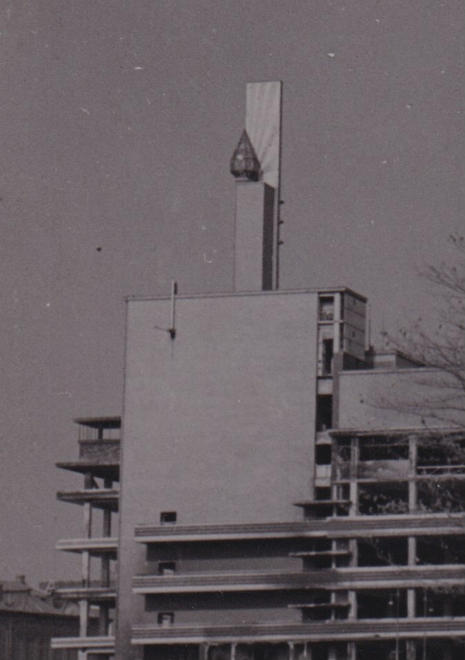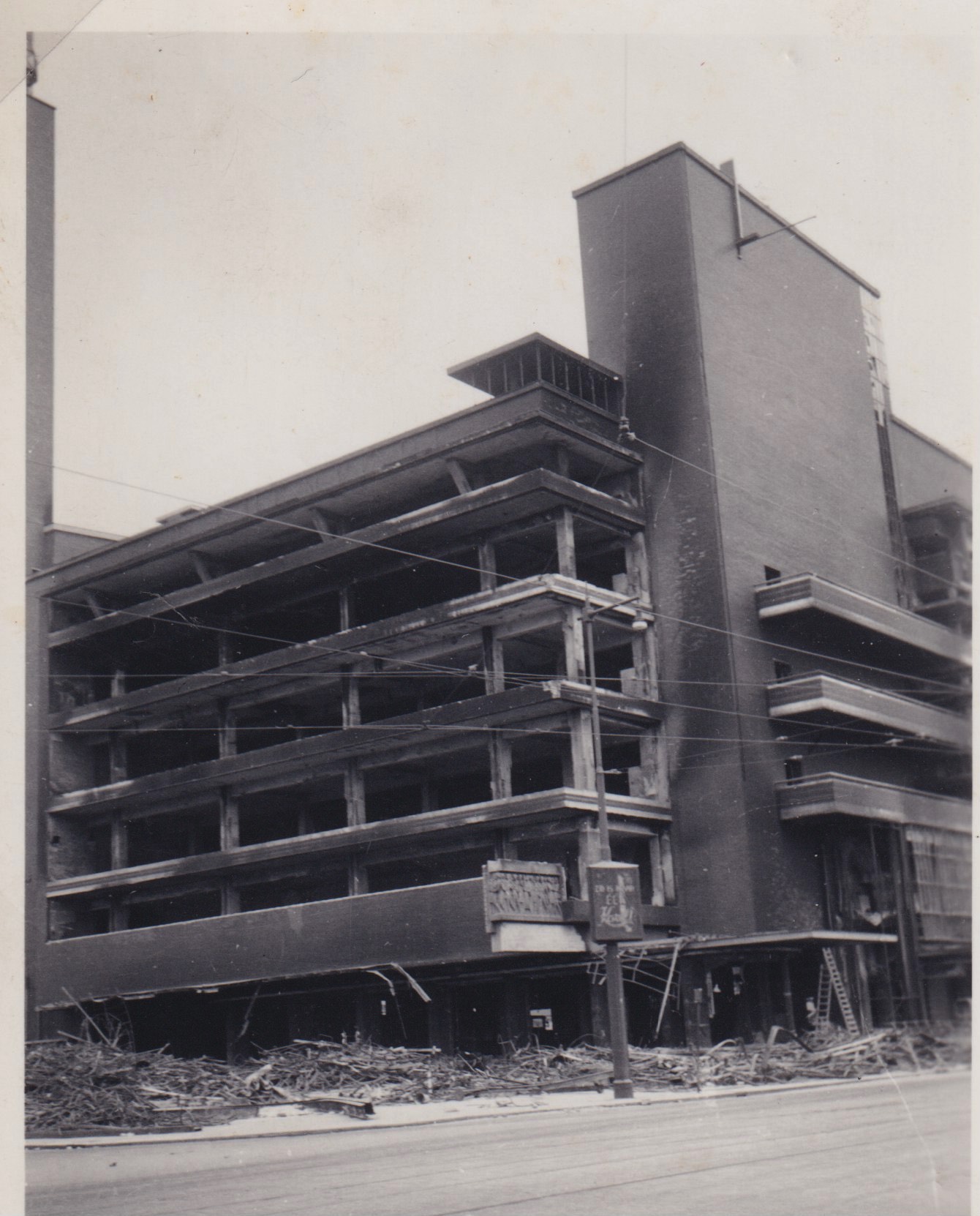deze opname blijft een groot raadsel voor me. De stralenkrans achter de lamp wijst de goede kant op, naar rechts, dus de opname is niet spiegelbeeldig. De lamp stond op een lange smalle toren, met er recht achter een dun vormgegeven plaat, maar die toren wordt op het zp-tje afgedekt. Ik heb zeker 200 opnamen van de gebombardeerde Bijenkorf, maar geen één die me verder helpt.