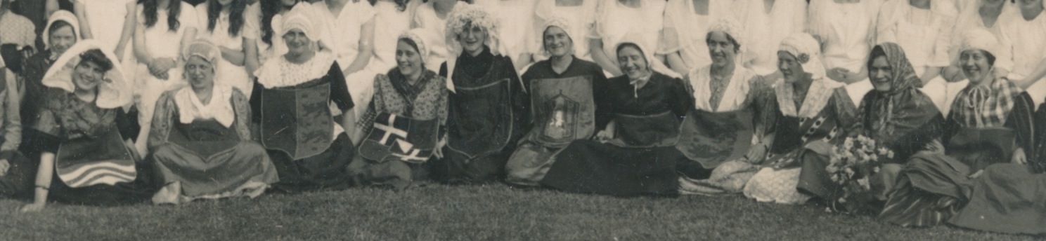 bij een goede beschouwing zie ik elf dames in het gras zitten met een schort waarop het provinciewapen