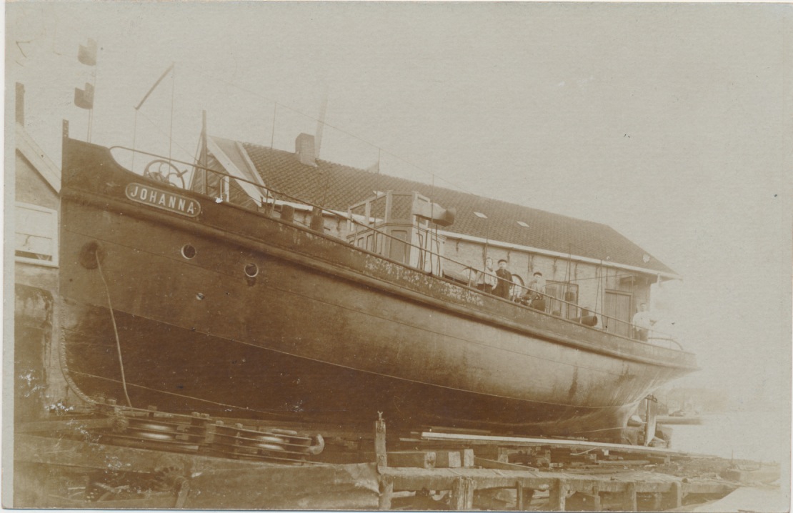 Het schip op de helling is overduidelijk een sleepboot. Volgens de registers van de scheepsmetingsdienst werd in 1908 de stoomsleepboot Johanna in Overschie gebouwd voor de gebroeders Roelofs in Rotterdam. Uit de website De Binnenvaart (http://www.debinnenvaart.nl/schip_detail/7824/) blijkt dat dit op de werf van Van Dam is geweest. Het schip bestaat, meer dan een eeuw oud en sterk verbouwd, nog steeds en vaart nu onder de naam Succes; zie https://www.rederijsucces.nl/ Het lijkt onmiskenbaar hetzelfde schip.