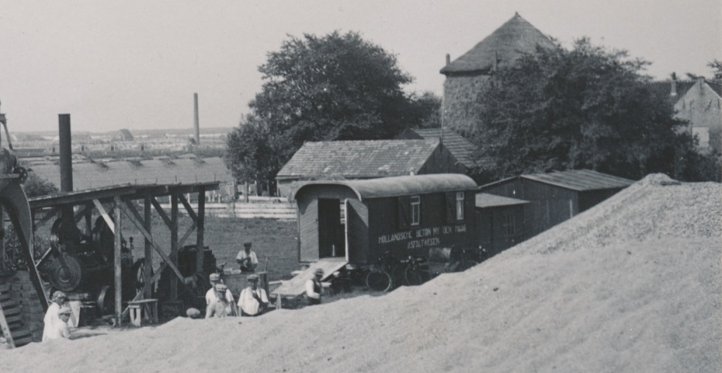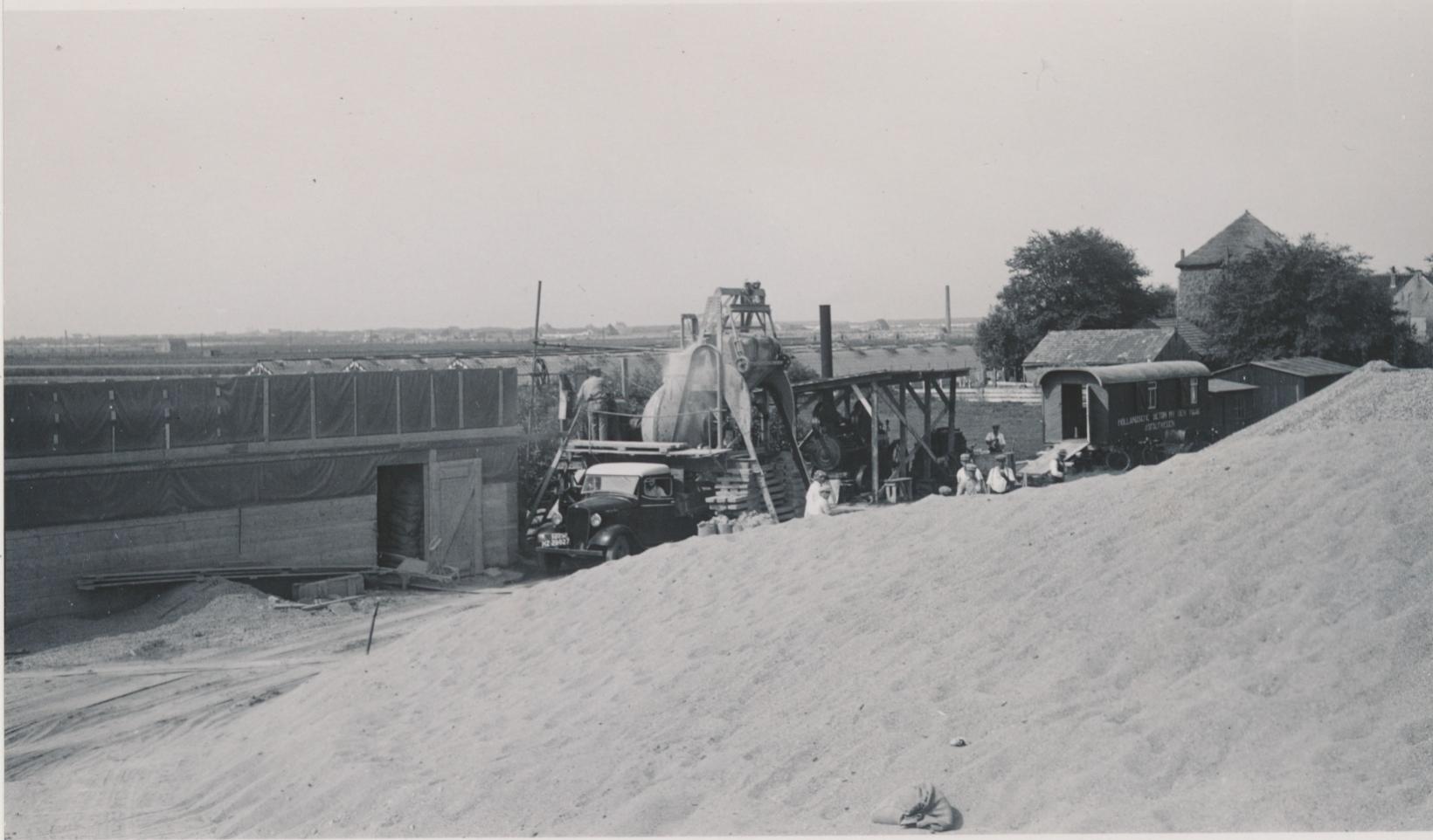 achter de tijdelijke opstallen en machine zijn kassen te zien en het lijkt erop of er rechts op de opname aan de horizon duinen zijn te zien