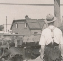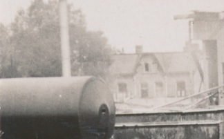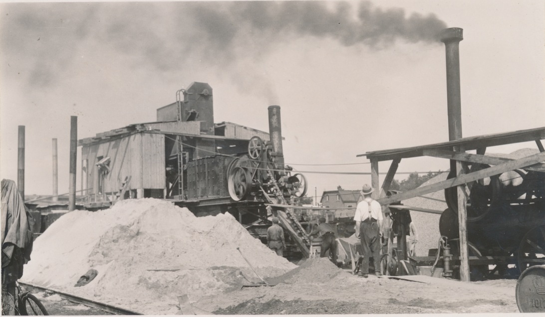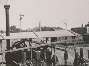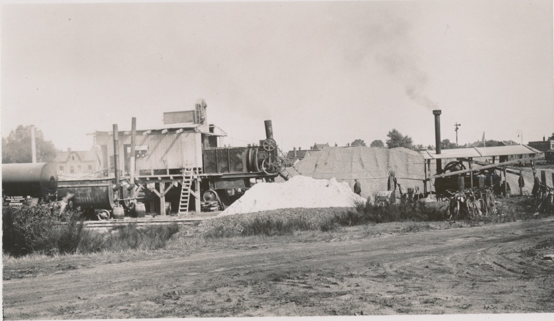 4592 stoommachine asfaltproductiemachine bij spoor, op achtergrond huizen