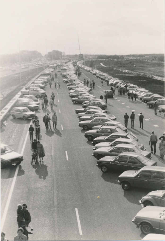 ik vermoed dat we uitkijken over de ring van Antwerpen (E34) vanaf het viaduct in de Grote Steenweg (N1, de voormalige hoofdweg van Antwerpen naar Brussel. We kijken in WZW richting. Rechts buigt zich dan de afslag Antwerpen-Zuid af. De doorgaande weg gaat naar de Kennedy-tunnel. Links komt de boog van Brussel erbij. Ik heb geen idee wat voor evenement hier plaatshad.