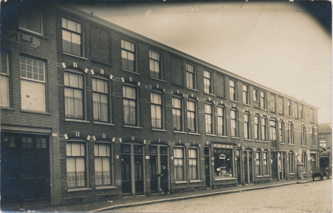 de huisnummers op vierkante bordjes van deze huizen met platte daken zijn heel vaag, maar als ik het goed zie beginnen ze vanaf links met 52. Opvallend dat op de bovenste etage om de twee ramen telkens een raam is dichtgemetseld. Alleen bij het pakhuis verderop is hiervan afgeweken.