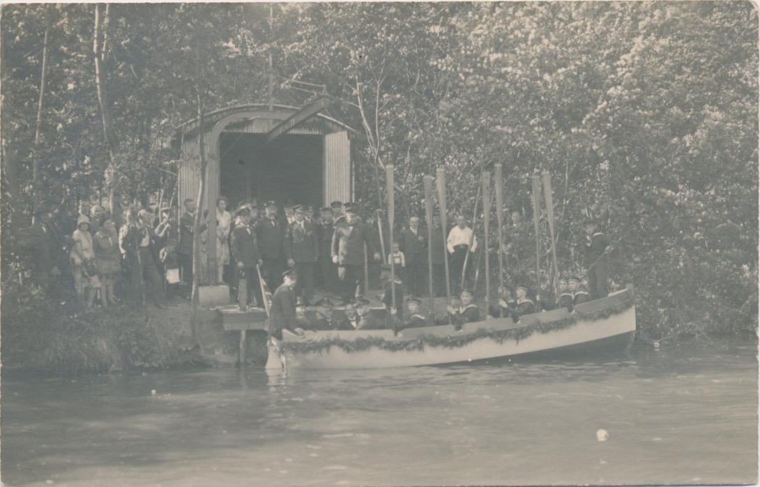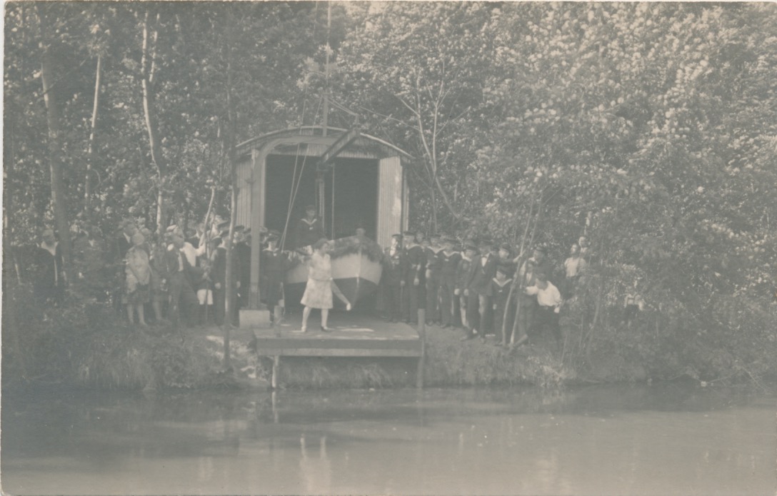 4735 tewaterlaten van een roeiboot vanuit een golfplaten botenhuis op de kant