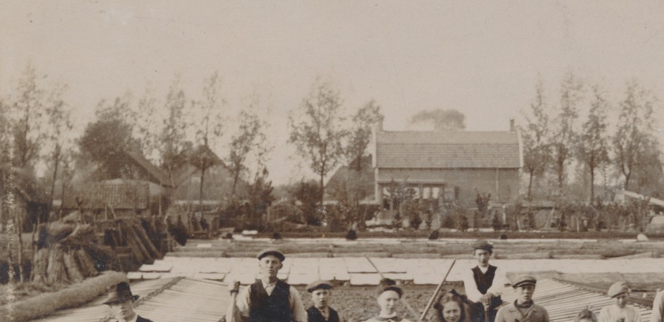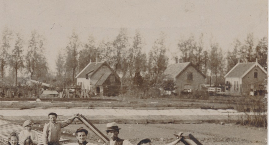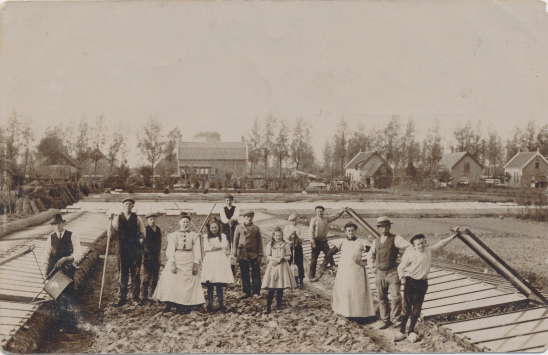 4933g 13 personen bij 'plat glas' met vrijstaande huizen op achtergrond WS