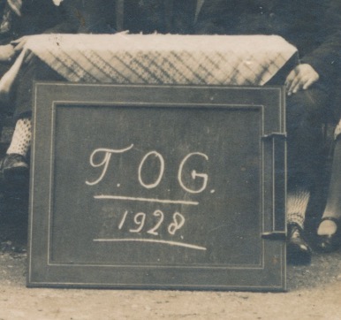 heeft het bestuur plaatsgenomen achter de tafel, met ervoor een bord waarop T.O.G. 1928