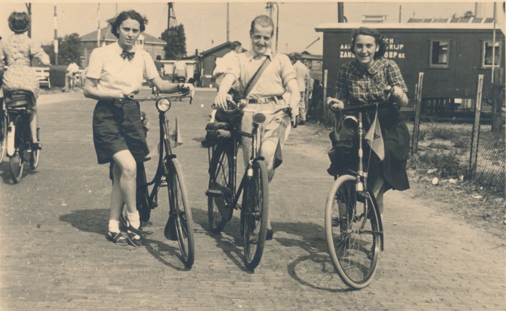 5258 groepsfoto van 3 fietsers bij een spoorwegovergang, fotograaf uit Den Haag