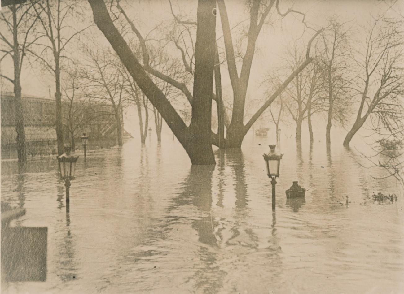 Dit zou nog wel eens Parijs kunnen zijn. Het half onder water staande bordje lijkt mij een officieel mededelingenbord dat je nog wel eens bij een Parijs' park aantreft. Mogelijk de beruchte Seineoverstroming in 1910.