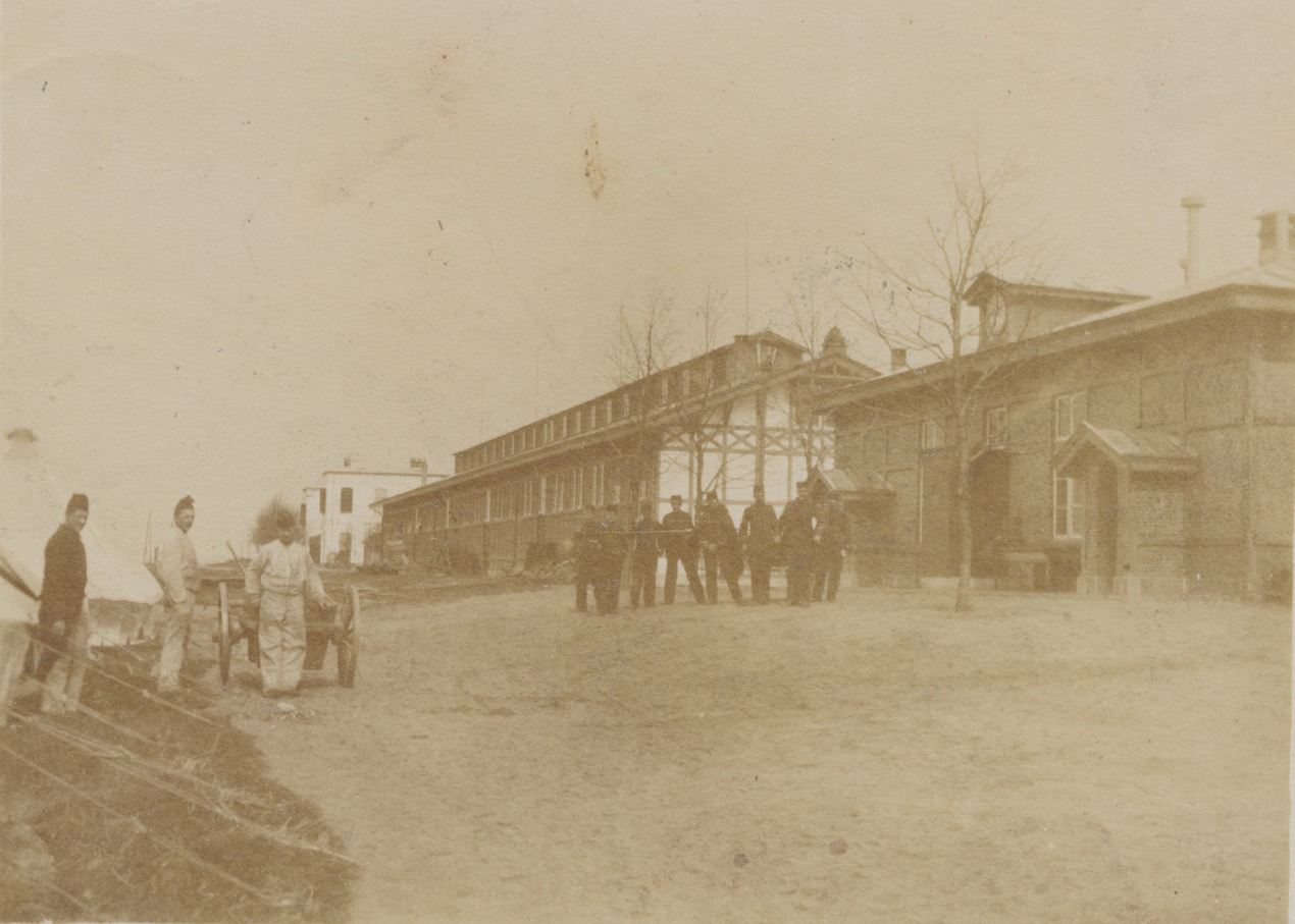 Bovenste rij 3e foto van links dezelfde situatie als op het ZP Links de grote witte gebouwen en in het midden de barak met opbouw: