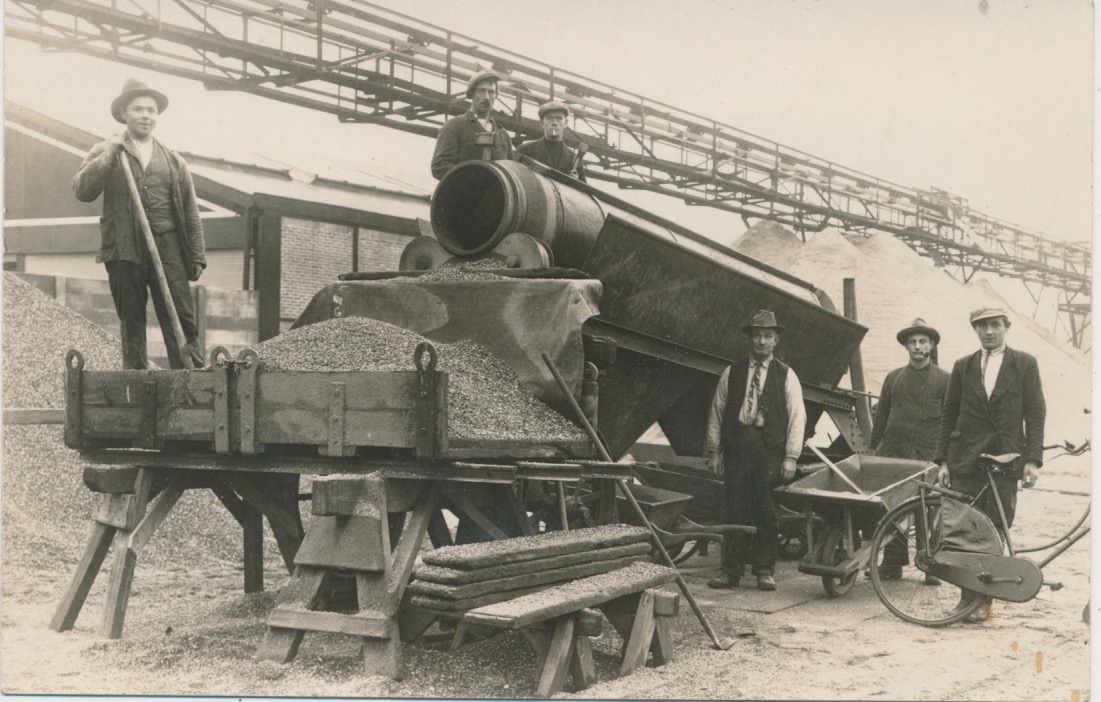 op een houten stellage staat een man bij schelpen of fijn grint en die schept het dan in de trommel?
