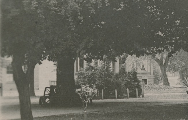 achter de houten plantenpot iets wat lijkt op een inrit met een dubbele rij bomen
