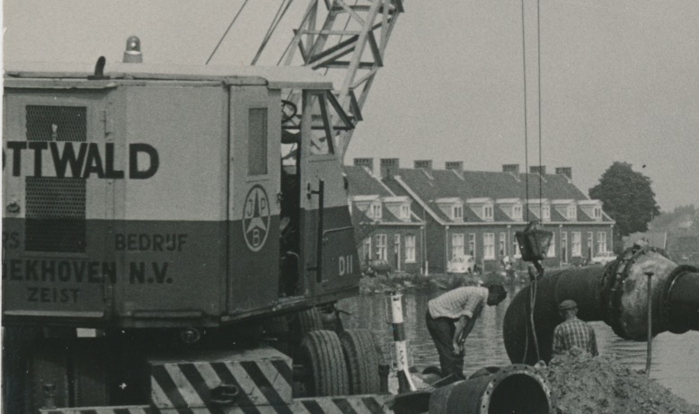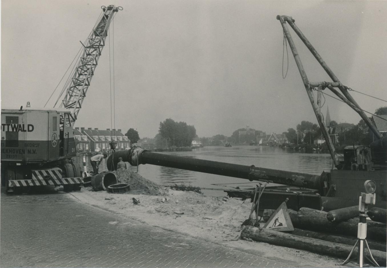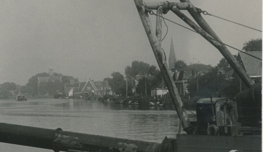 5673 buizenaanleg langs rivier met 2 kerken op achtergrond 1969