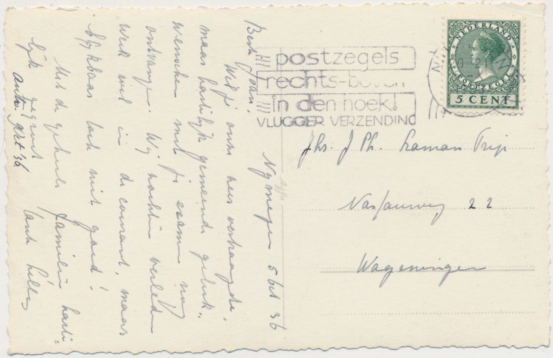 verzonden door tante Lilly naar jhr. J.Ph. Laman Trip (Joan) in Wageningen
