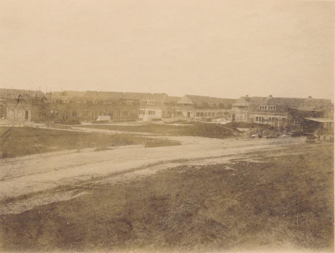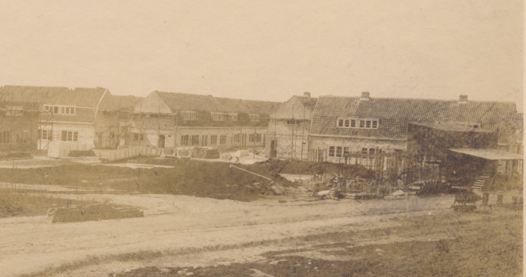 op het bouwterrein rijden lorries voor de aanvoer van bouwmaterialen, waaronder rioolbuizen