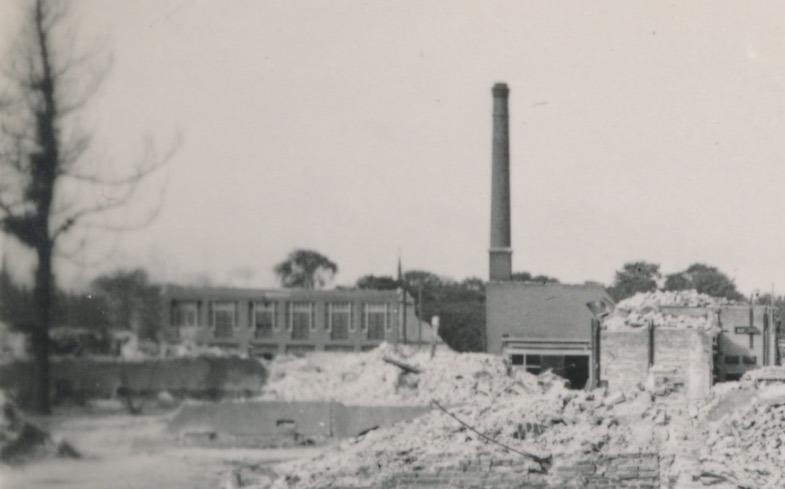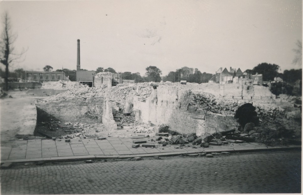 rechts een uitgebrand woonhuis met 2 puntdaken