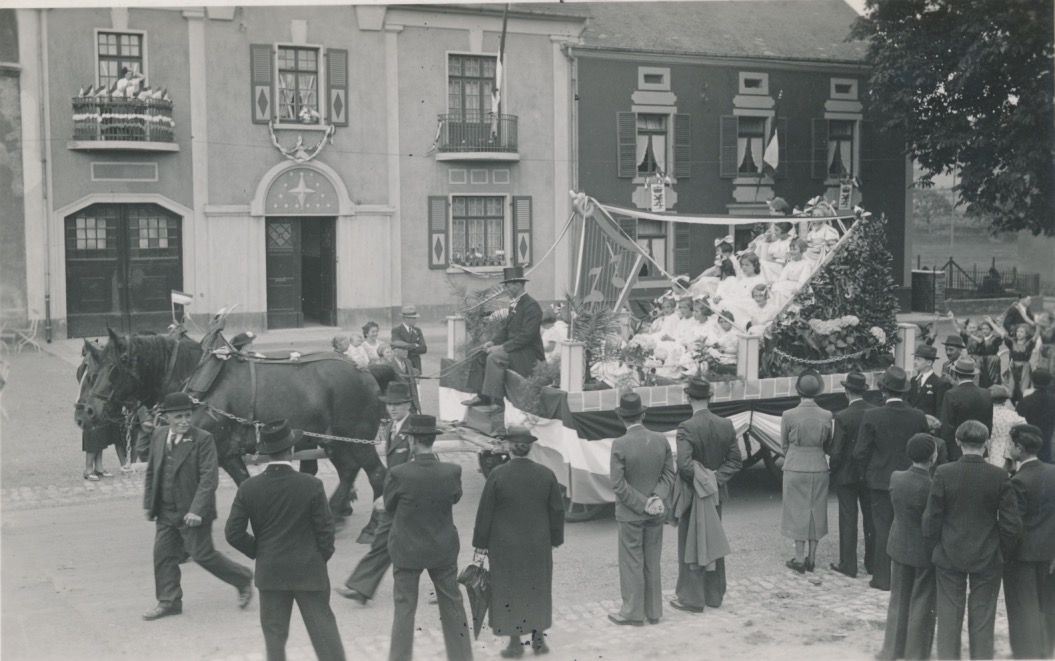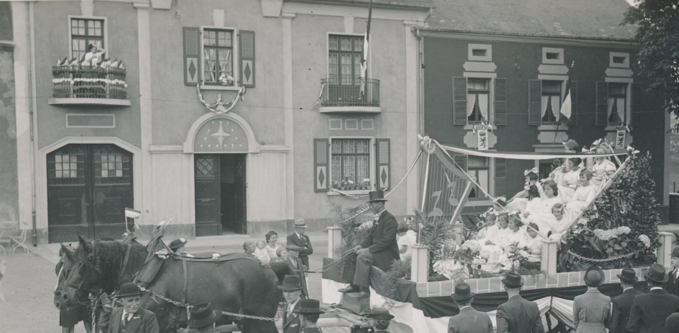 aan de gevel, achter de kar volgeladen met jonge meisjes, zijn 2 wapens te zien met een gekroonde leeuw