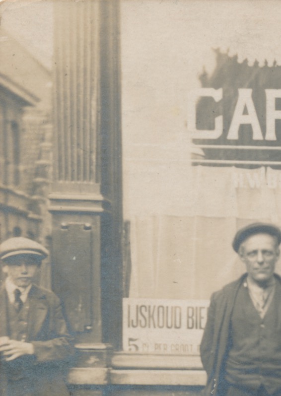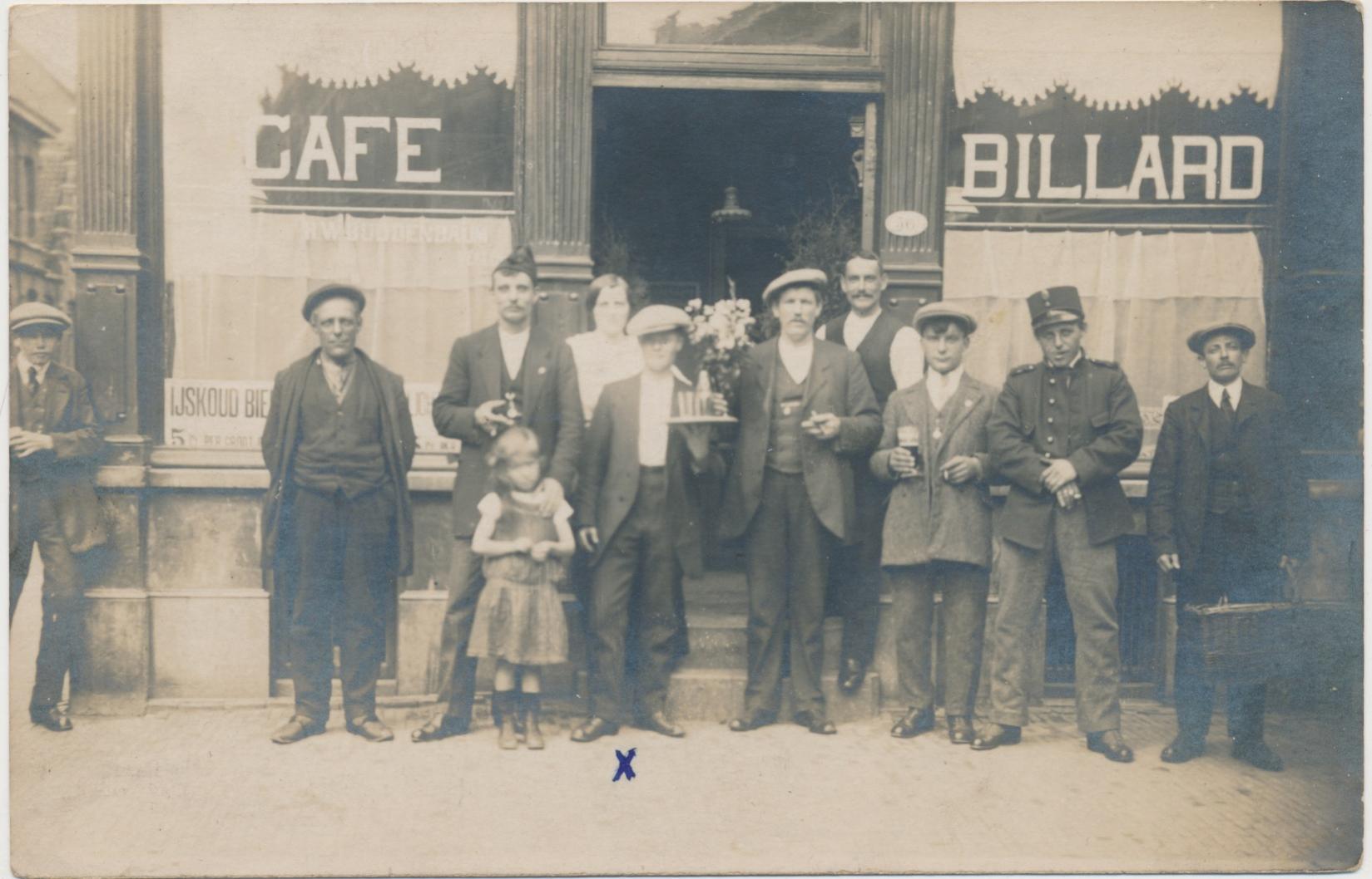 het café is gelegen op een hoek, op het raam links staat H.W. Buddenbaum